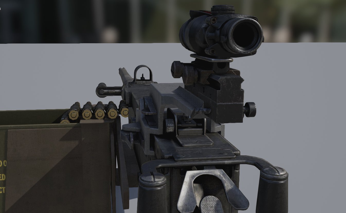 Model M240B został, jak widać, oteksturowany i będzie występować w trzech wersjach: FN MAG 58 dla milicji i powstańców (domysł autora) oraz L7A2 dla Brytysjkich Sił Zbrojnych i M240B dla US Army. Co ciekawe na zdjęciu przedstawione są jedynie dwie wersje; ten z ładownicą w kamuflażu na naboje karabinowe to M240B, karabin z pomarańczową (drewnianą?) kolbą to FN MAG 58 bądź L7A2 -  ciężko powiedzieć.