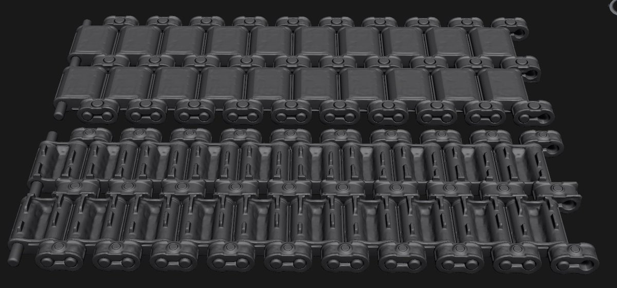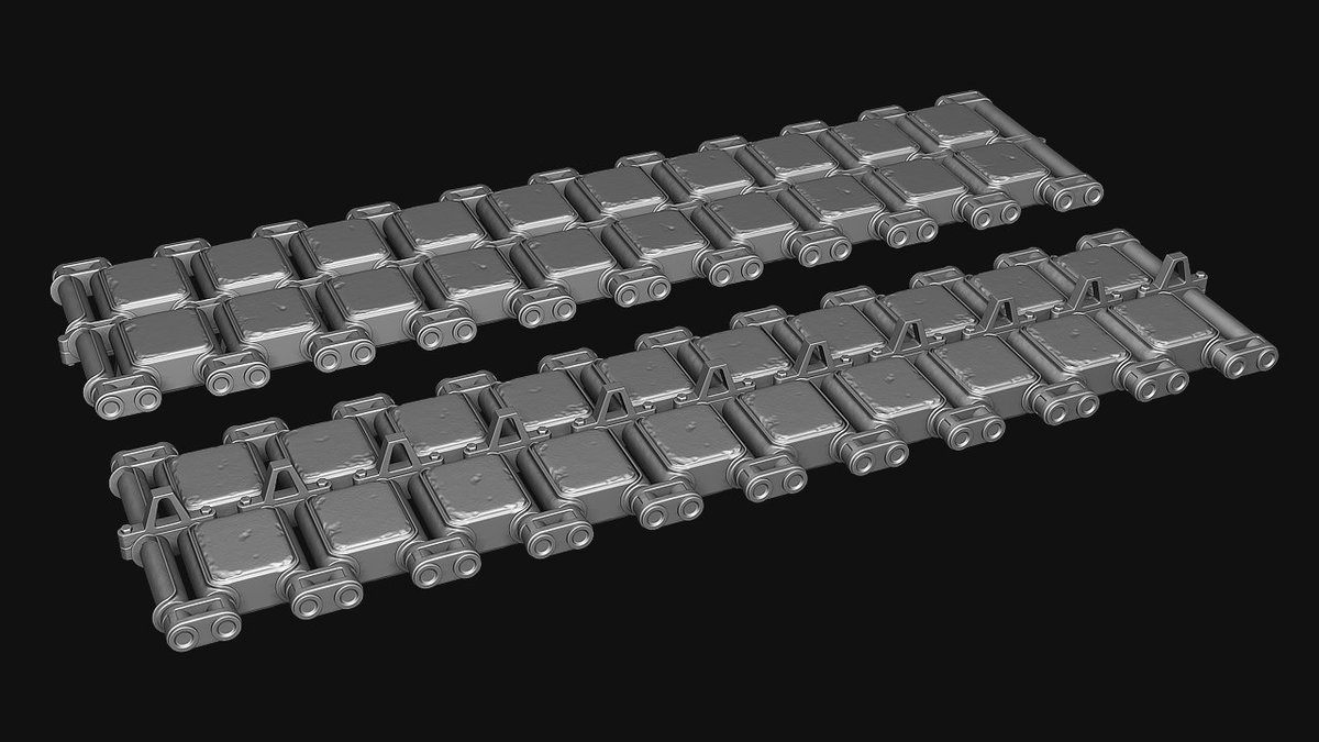 Dolna gąsienica jest używana w czołgach T90 i T72B3. Górna to prawdopodobnie jej poprzednia, mniej szczegółowa forma. /edit. Kuźwa co ja piszę. Przecież to na górze to gąsienica odwrócona do góry nogami [facepalm]