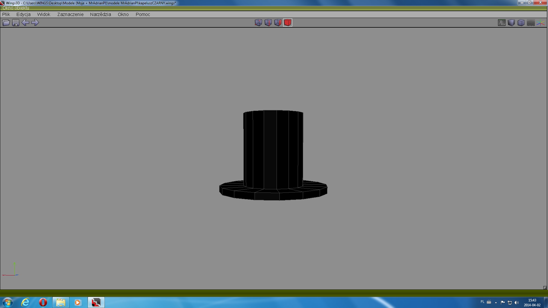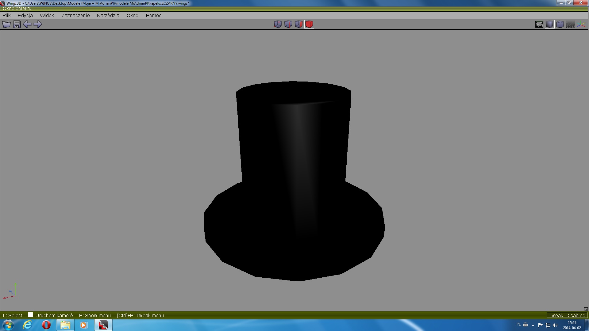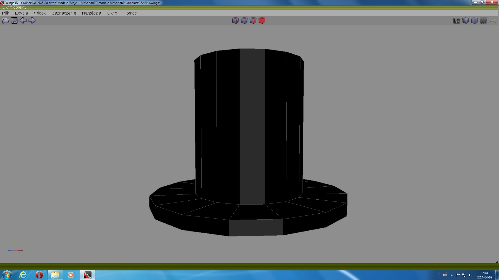 Nie wiem, czy wszystko zrobiłem dobrze. Co budzi we mnie wątpliwości? Otóż cylinder rzeczywiście jest czarny, ale gdy obracam kamerę w wingsie, czasami na oteksturowanym modelu pojawiają mi się szare plamy, Nie mam pojęcia, skąd one się wzięły - wyglądają moim zdaniem jak cienie. Czy tak powinno być? Czy wy też tak macie, kiedy robicie własne modele?