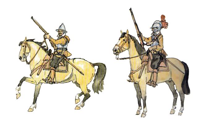 - typowa zbroja rajtarska - w postaci hełmu typu szturmak lub pappenheimer (rzadziej morion) oraz kirysu niekiedy z naramiennikami, nałokietnikami, parą zarękawi, folgowanymi nabiodrkami i parą